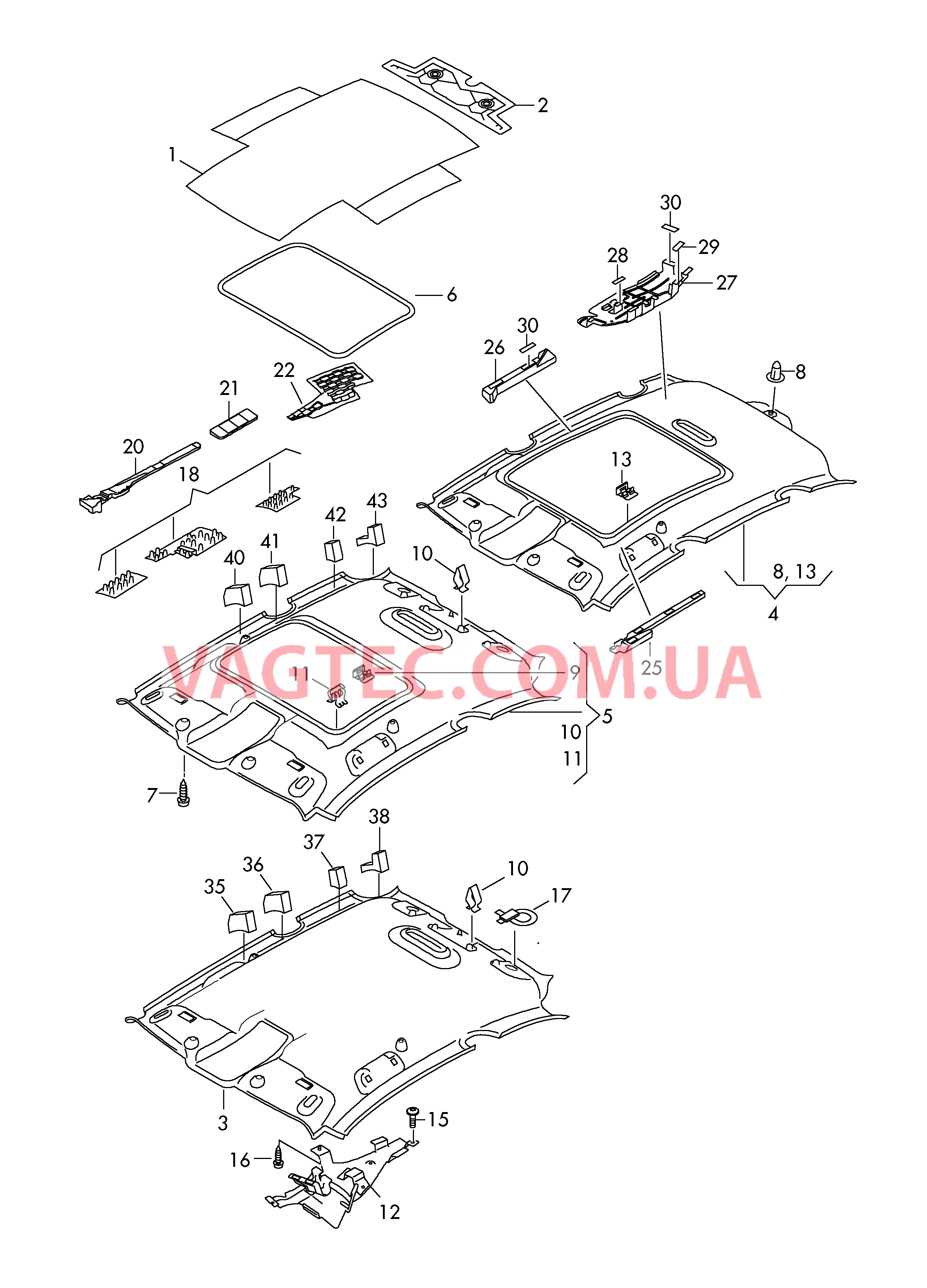| 5 | 8T0867501AV39 | Формованная панель потолка для а/м с люком серебристый sternsilber | -SC,UD,UF; 03.10 - 05.12 | ||