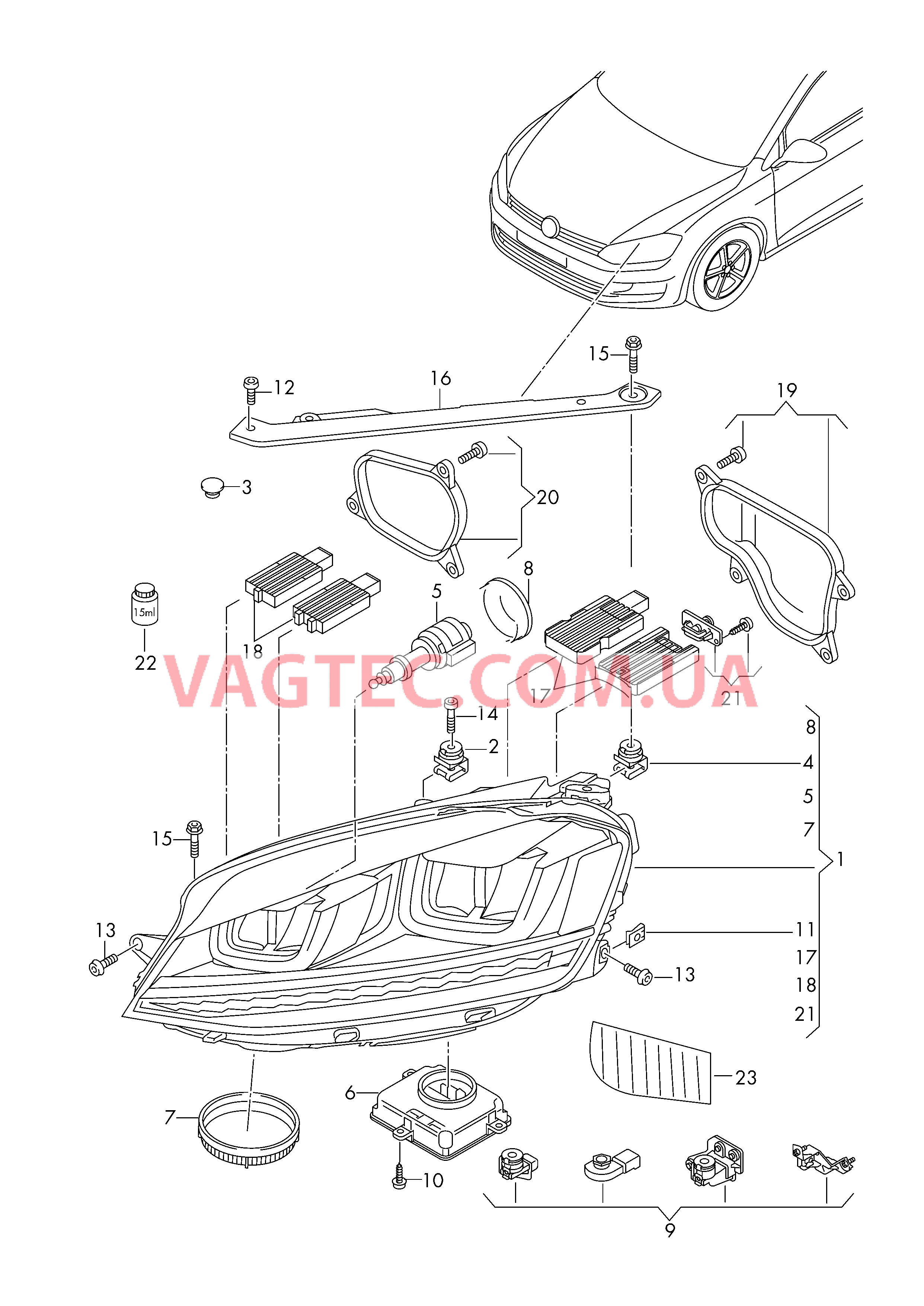 | 9 | 5GE998225 | Ремонтный комплекткорпуса фары | лев. | X | |