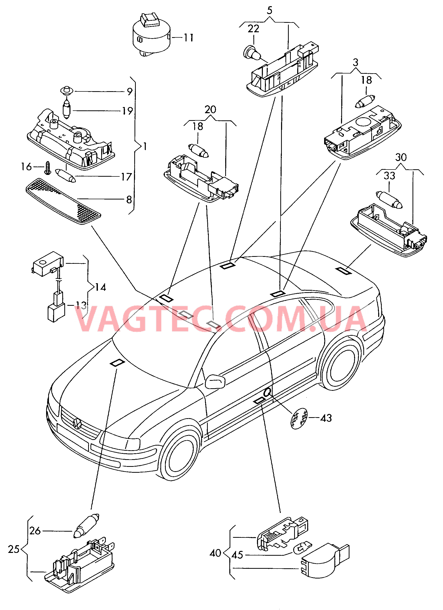 | 5 | 3B0951171D | Плафон для чтения с ультразву-ковым датчиком | лев. ; больше не поставляется | 1 | |