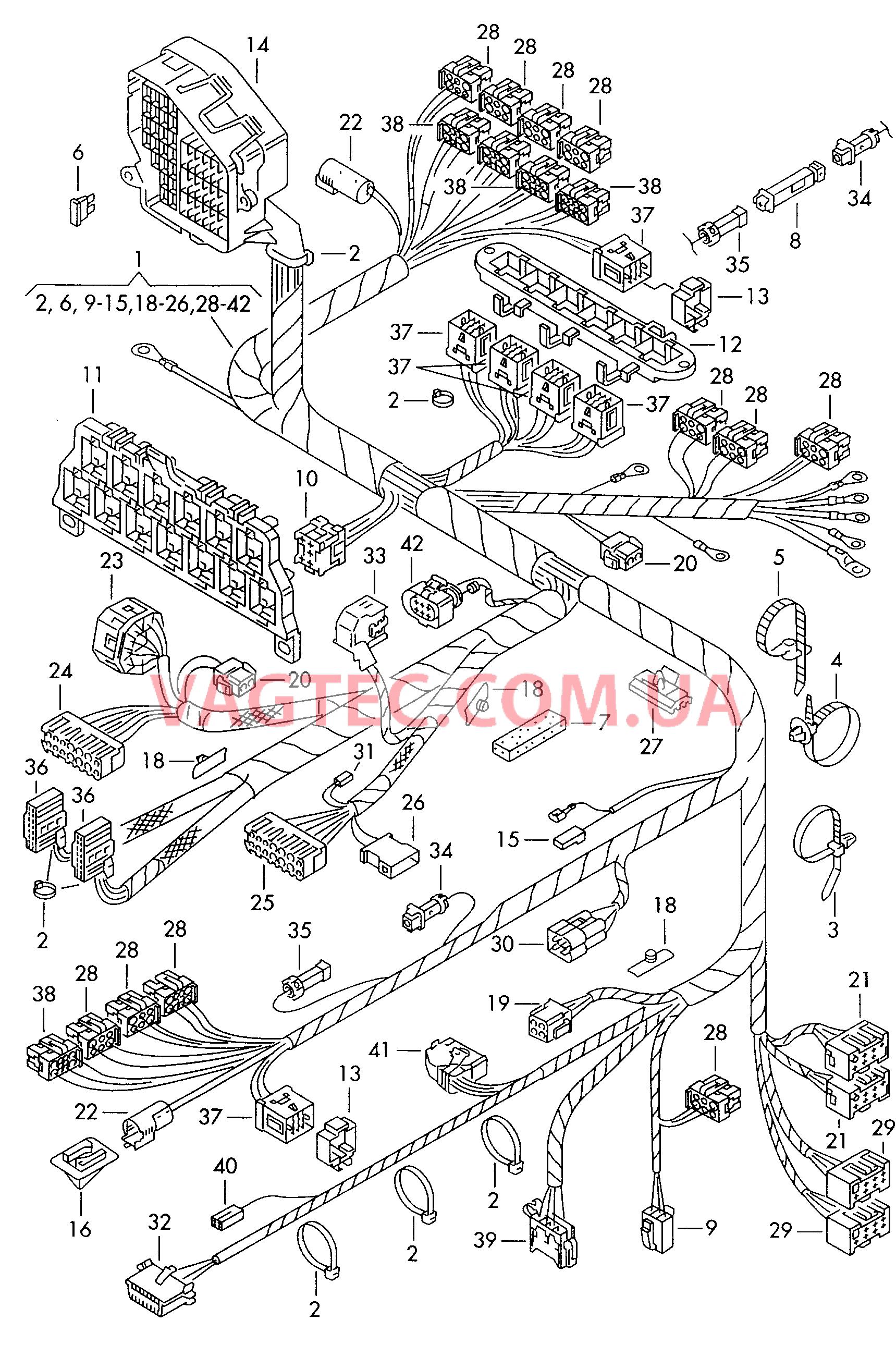 | 29 | 4B0972575 | Корпус плоского разъёма сфиксатором контактов Жгут проводов для моторн. отс. Жгут проводовсистемы навигации Жгут проводов для двигателя | 15-ти штекерн. | X 1 1 1 | |