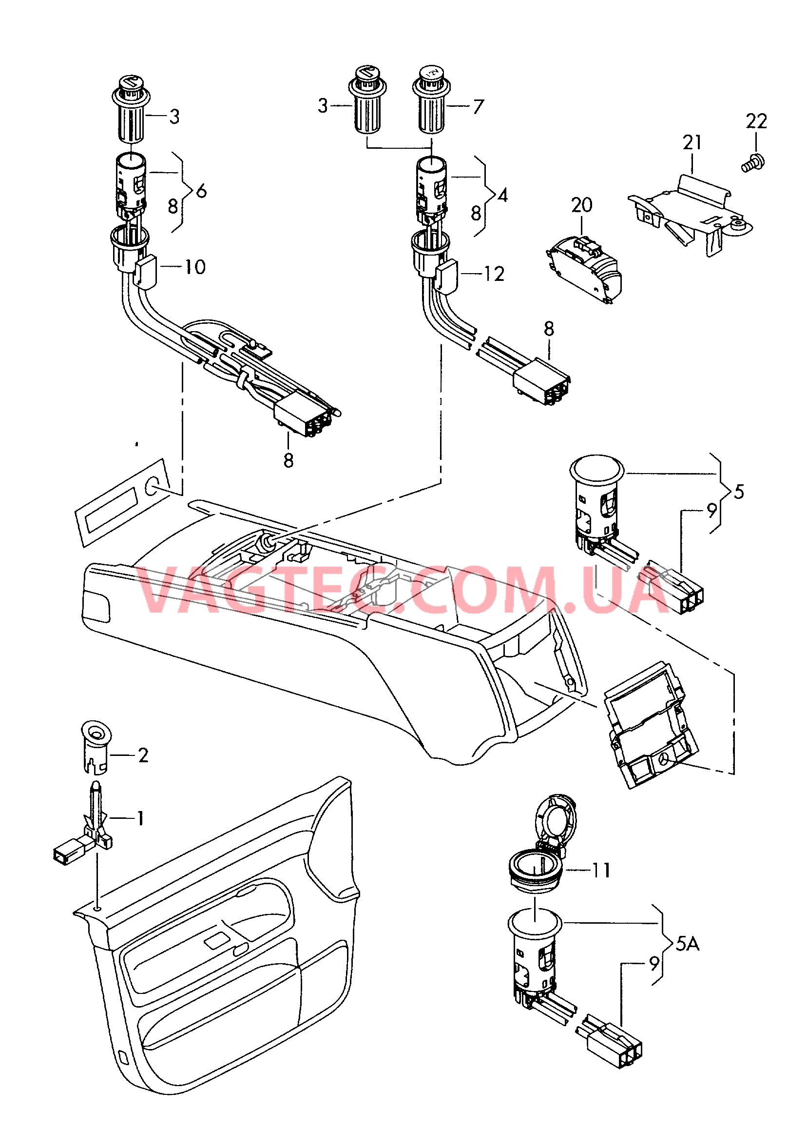 | 4 | 3D0919309D | Штепсельный разъем Центральная консоль | справа спереди | X | |