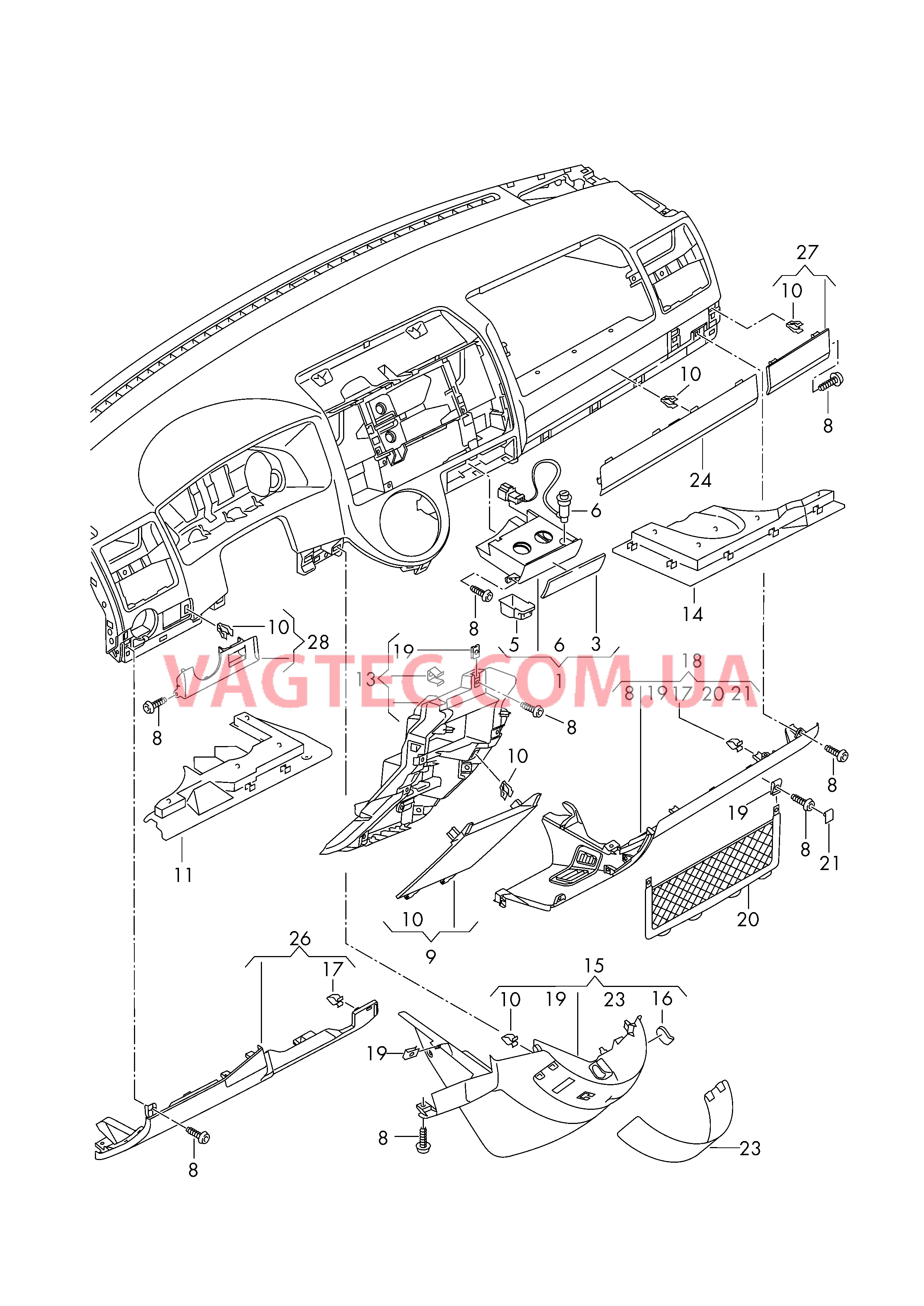 | 18 | 7H1858904F30T | Облицовка (сторона переднего пассажира) classicgrey (серый) | ЛВPЛ 08.09 - 05.11 | ||
